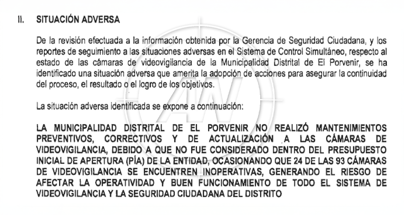 La Contraloría General de la República alertó que 24 de las 93 cámaras de seguridad instaladas en El Porvenir se encuentran fuera de servicio, reduciendo significativamente la capacidad de respuesta frente a incidentes en el distrito. El informe señala que esta situación se debe a la falta de mantenimientos preventivos y correctivos que no fueron contemplados en el Presupuesto Inicial de Apertura del 2025.