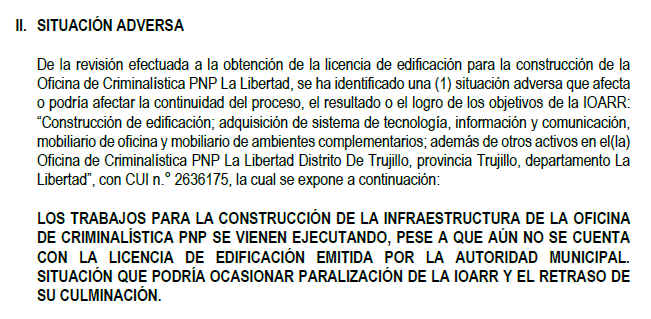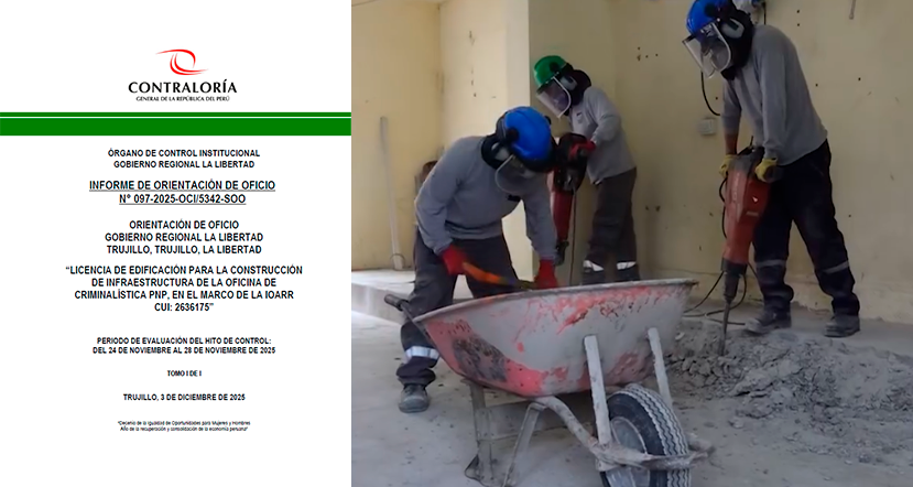 La Contraloría General detectó que el Gobierno Regional de La Libertad viene ejecutando la construcción de la futura Oficina de Criminalística de la PNP pese a no contar con la licencia de edificación emitida por la Municipalidad Provincial de Trujillo, requisito indispensable para el avance de cualquier obra de este tipo. Así lo revela el Informe de Orientación de Oficio N.° 097-2025-OCI/5342-SOO.