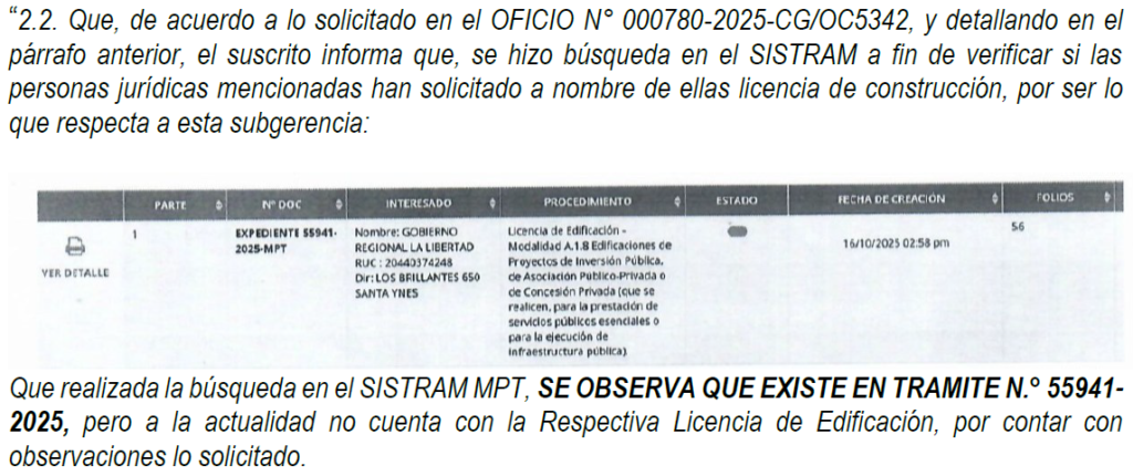 El informe advierte que continuar los trabajos sin licencia podría desencadenar sanciones municipales, la paralización de la obra y un eventual retraso en su culminación. Además, recuerda que la Ley 29090 exige que toda edificación se ejecute conforme al planeamiento urbano y cuente con la licencia otorgada por la municipalidad competente.