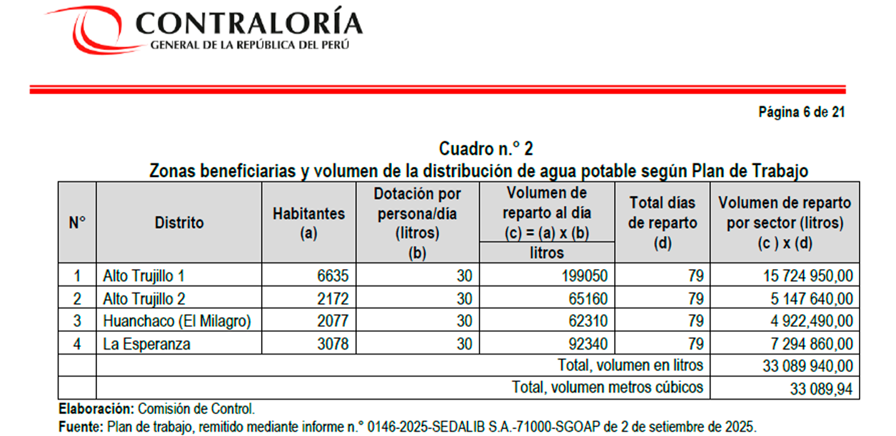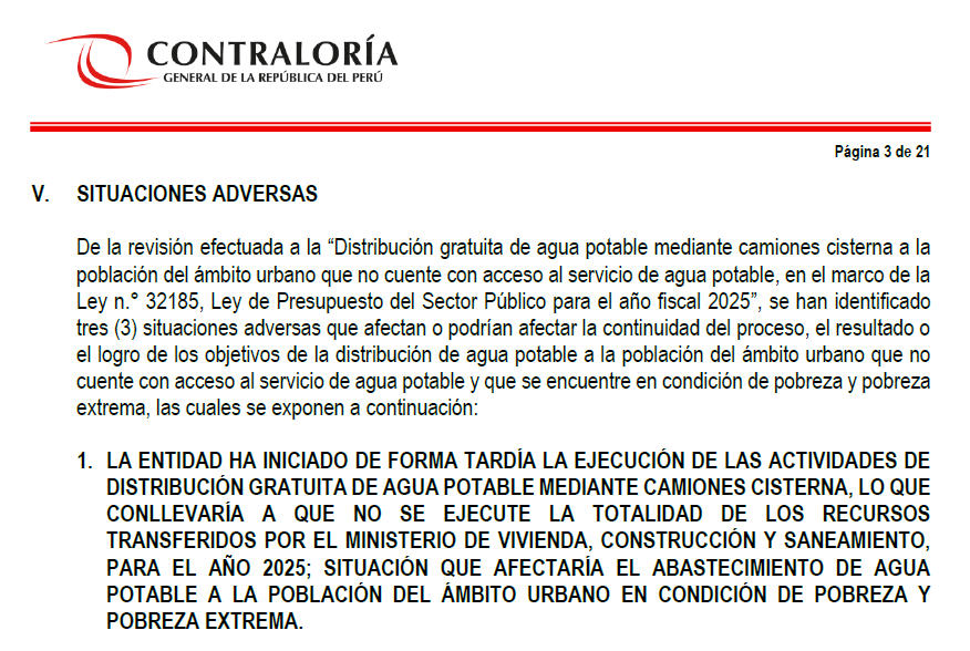 La Contraloría General de la República alertó que SEDALIB distribuyó agua potable gratuita a poblaciones vulnerables de Trujillo utilizando camiones cisterna con tanques oxidados en su interior, situación que vulnera la normativa sanitaria y que podría haber puesto en riesgo la salud de miles de familias en condición de pobreza y pobreza extrema.