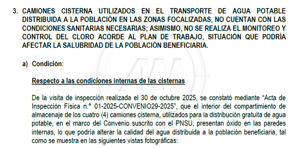 El hallazgo fue documentado en el Informe de Visita de Control N.° 016-2025-OCI/0264-SVC, que inspeccionó el servicio de reparto de agua financiado por el Ministerio de Vivienda, Construcción y Saneamiento (MVCS). La Contraloría verificó que los cuatro vehículos utilizados —donados por OTASS a la empresa— presentan áreas de óxido en las paredes internas de los tanques de almacenamiento.