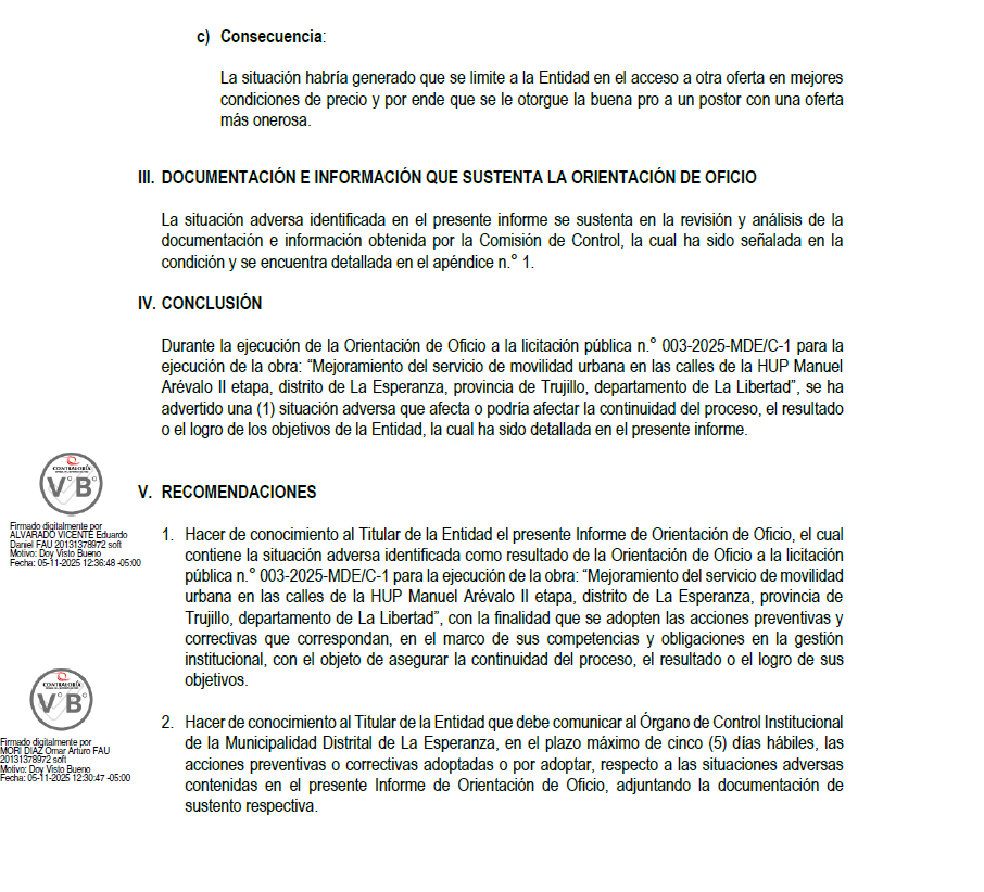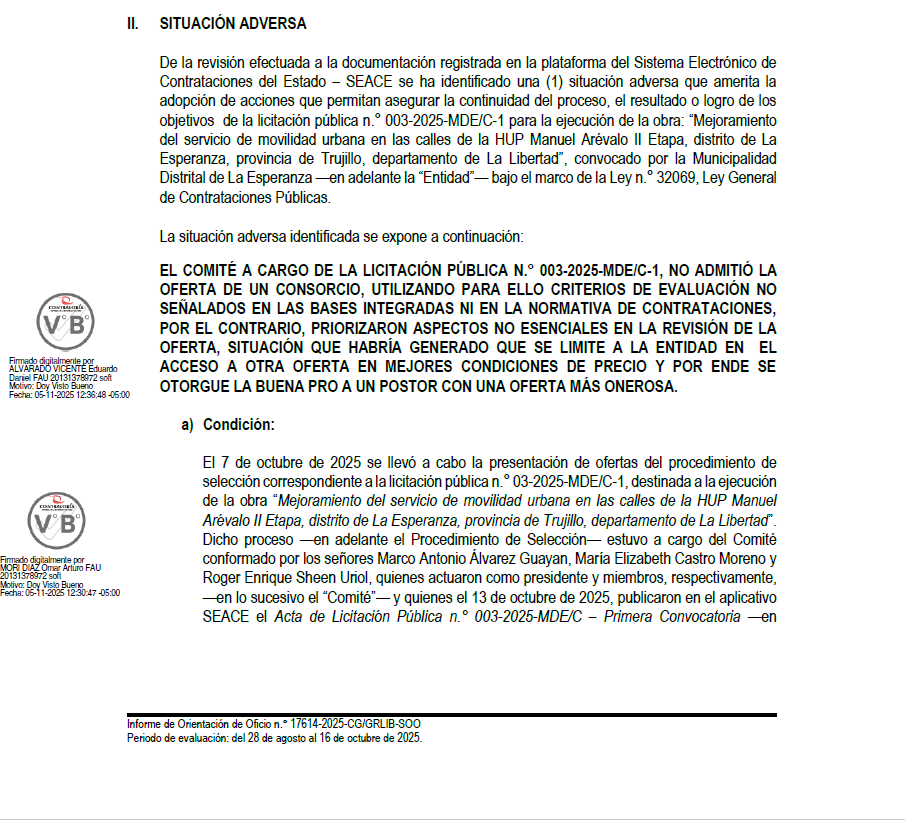 La Contraloría General de la República, a través de la Gerencia Regional de Control de La Libertad, emitió el Informe de Orientación de Oficio N.° 17614-2025-CG/GRLIB-SOO, donde se advierten irregularidades en la Licitación Pública N.° 003-2025-MDE/C-1, convocada por la Municipalidad Distrital de La Esperanza, para la ejecución de la obra “Mejoramiento del servicio de movilidad urbana en las calles de la HUP Manuel Arévalo II Etapa”, con una inversión superior a S/ 10 millones.