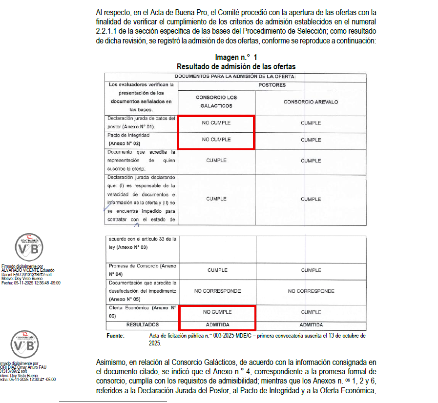 El informe, elaborado entre el 26 de agosto y el 16 de octubre de 2025, señala que el Comité de Selección descalificó la oferta más económica presentada por el Consorcio Galácticos, aplicando criterios no contemplados en las bases integradas ni en la Ley de Contrataciones del Estado, lo que habría permitido favorecer al Consorcio Arévalo, ganador de la buena pro con una propuesta de S/ 10 278 540,70, pese a que el postor descalificado ofrecía S/ 9 974 069,12, es decir, más de S/ 300 mil soles menos.
