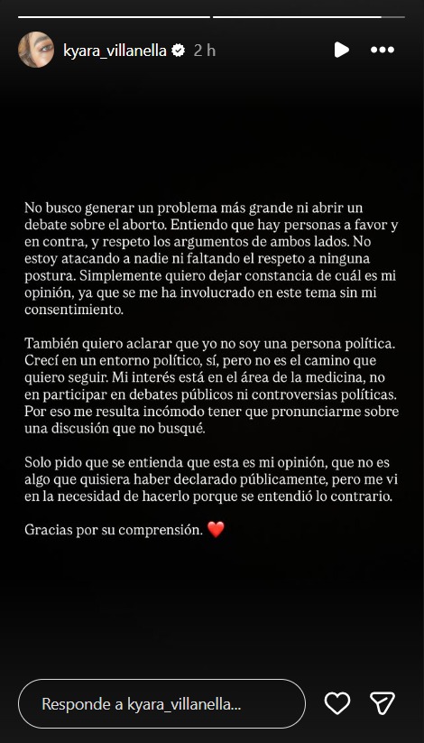 Asimismo, recalcó que pertenecer a la misma familia no implica compartir las mismas ideas y aclaró que no busca abrir un debate político. Indicó además que no tiene aspiraciones en ese ámbito, pues su interés profesional está orientado hacia la Medicina. Sus declaraciones se producen luego de que la excandidata presidencial reiterara en una entrevista que solo respalda el aborto terapéutico y que, ante un caso de violación, recomendaría continuar con el embarazo, postura que generó amplio debate público.