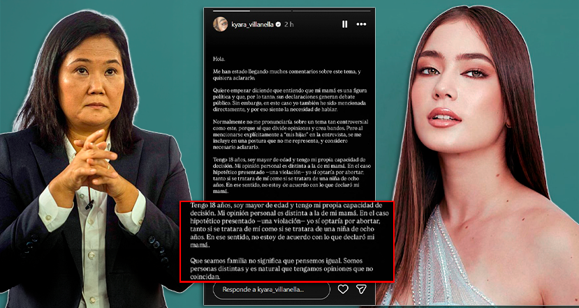 Kyara Villanella, hija mayor de Keiko Fujimori, expresó públicamente su desacuerdo con las recientes declaraciones de su madre sobre el aborto en casos de violación. A través de un mensaje difundido en su cuenta de Instagram, sostuvo que su opinión es distinta y que decidió pronunciarse luego de haber sido aludida directamente en una entrevista televisiva.