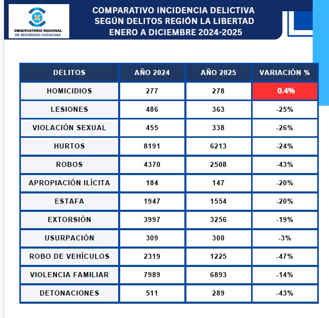 La región La Libertad registra una reducción global del 25 % en la incidencia delictiva durante el periodo 2024-2025, de acuerdo con información del Observatorio Regional de Seguridad Ciudadana, que utiliza datos de la Región Policial La Libertad. Los resultados coinciden con la inversión realizada por el Gobierno Regional para fortalecer la operatividad de la Policía Nacional del Perú.