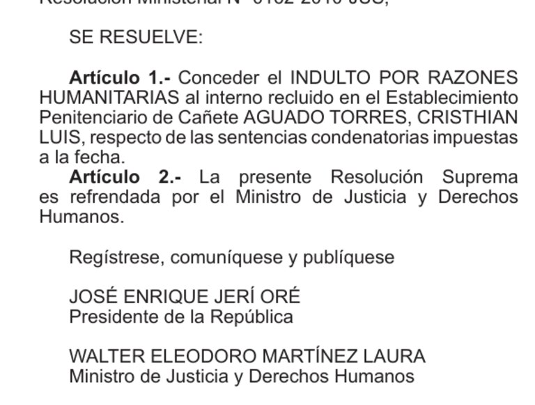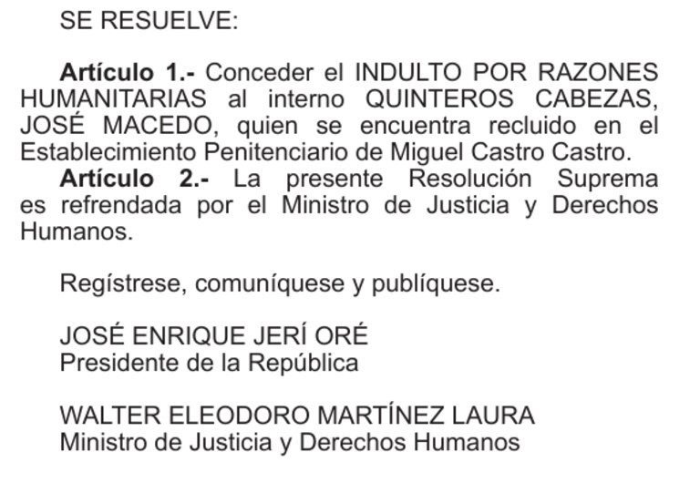 Los beneficiados son Juan Carlos Cárdenas Paredes y Luis Alberto Escobar Flores, cuyos casos fueron evaluados por la Junta Médica Penitenciaria y la Comisión de Gracias Presidenciales. Ambas instancias determinaron que su estado de salud es incompatible con la permanencia en un establecimiento penitenciario, además de no representar un riesgo para la sociedad.