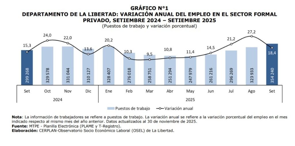 Según datos del Ministerio de Trabajo y Promoción del Empleo, en setiembre de 2025, La Libertad registró un crecimiento del empleo formal privado de 18,4 %, es decir, se generaron 55 mil puestos de trabajo más en comparación al mismo periodo del año anterior.