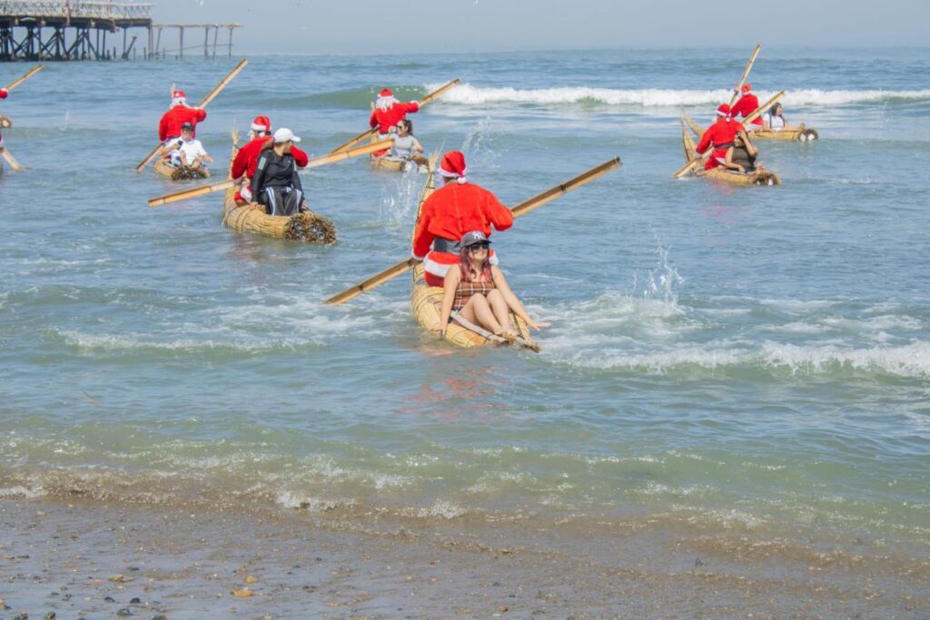 Los “Santas” huanchaqueros llevaron la tradición marítima a otro nivel, combinando la cultura local con el espíritu navideño. Con sus trajes rojos y barbas blancas, se subieron a los caballitos de totora y mostraron una vez más la vigencia de esta práctica ancestral.