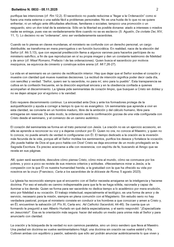 En su mensaje, el Santo Padre animó a los seminaristas a vivir este tiempo como un camino de encuentro profundo con Cristo. Recordó que el seminario no es solo estudio y preparación académica, sino un proceso de maduración humana, espiritual y comunitaria. “Lo decisivo no es ordenarse, sino ser verdaderamente sacerdotes”, destacó.