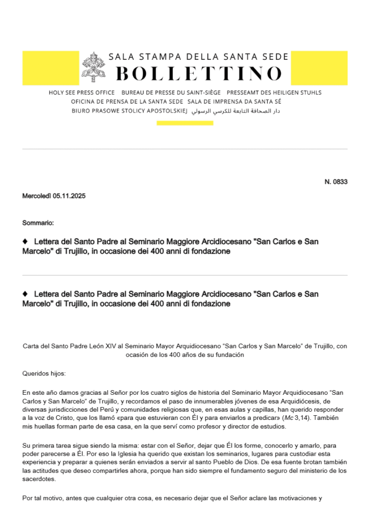 Finalmente, el Papa León XIV encomendó al seminario y a sus familias a la protección de la Virgen María y de San José, e impartió su bendición apostólica como signo de cercanía. La celebración contó con la participación de obispos de diversas jurisdicciones, sacerdotes y fieles, quienes expresaron su alegría por estos cuatro siglos de historia y servicio a la Iglesia en el Perú.