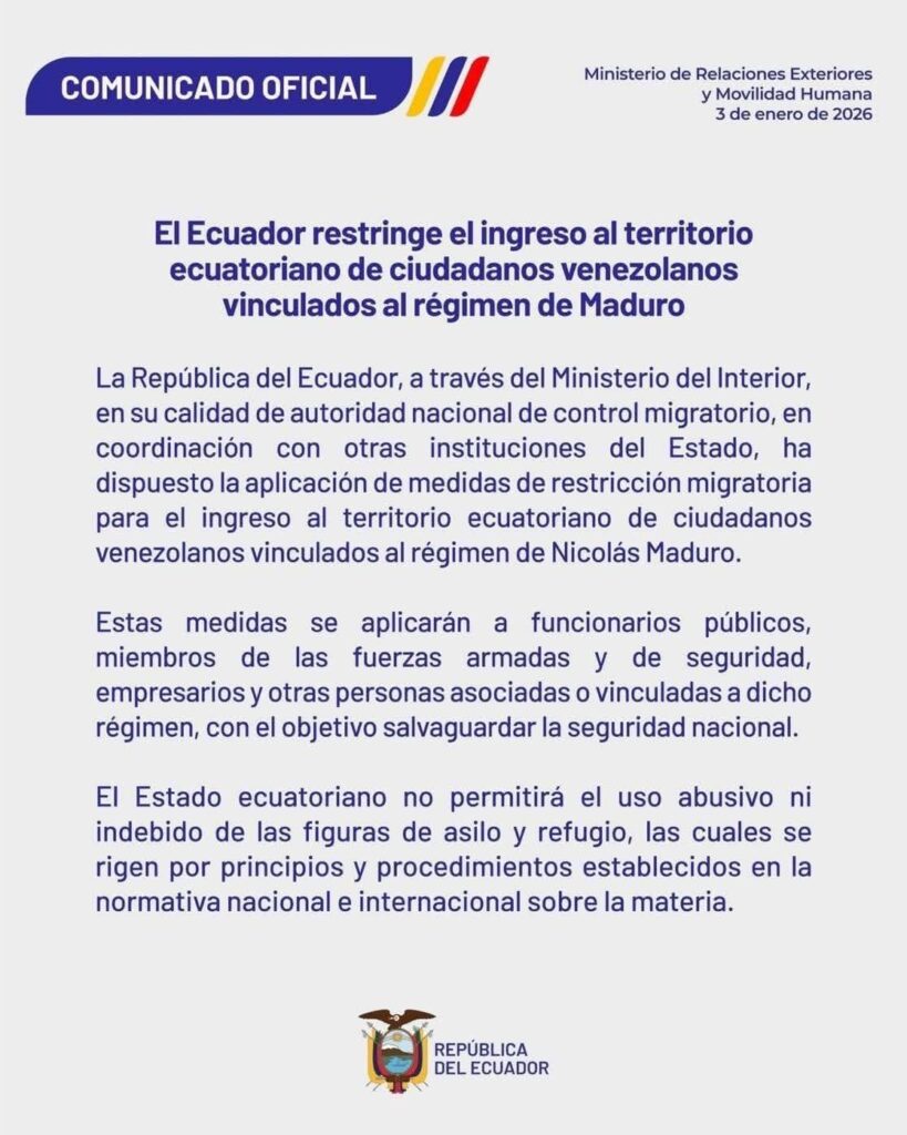 En una línea similar, el Gobierno de Ecuador anunció el sábado 3 de enero de 2026 la activación de restricciones migratorias contra personas asociadas directa o indirectamente al gobierno de Nicolás Maduro. La medida, comunicada por el Ministerio de Relaciones Exteriores y Movilidad Humana, será ejecutada por las autoridades de control migratorio en coordinación con otras entidades del Estado, y busca reforzar los filtros de ingreso al territorio ecuatoriano ante posibles amenazas a la seguridad.
